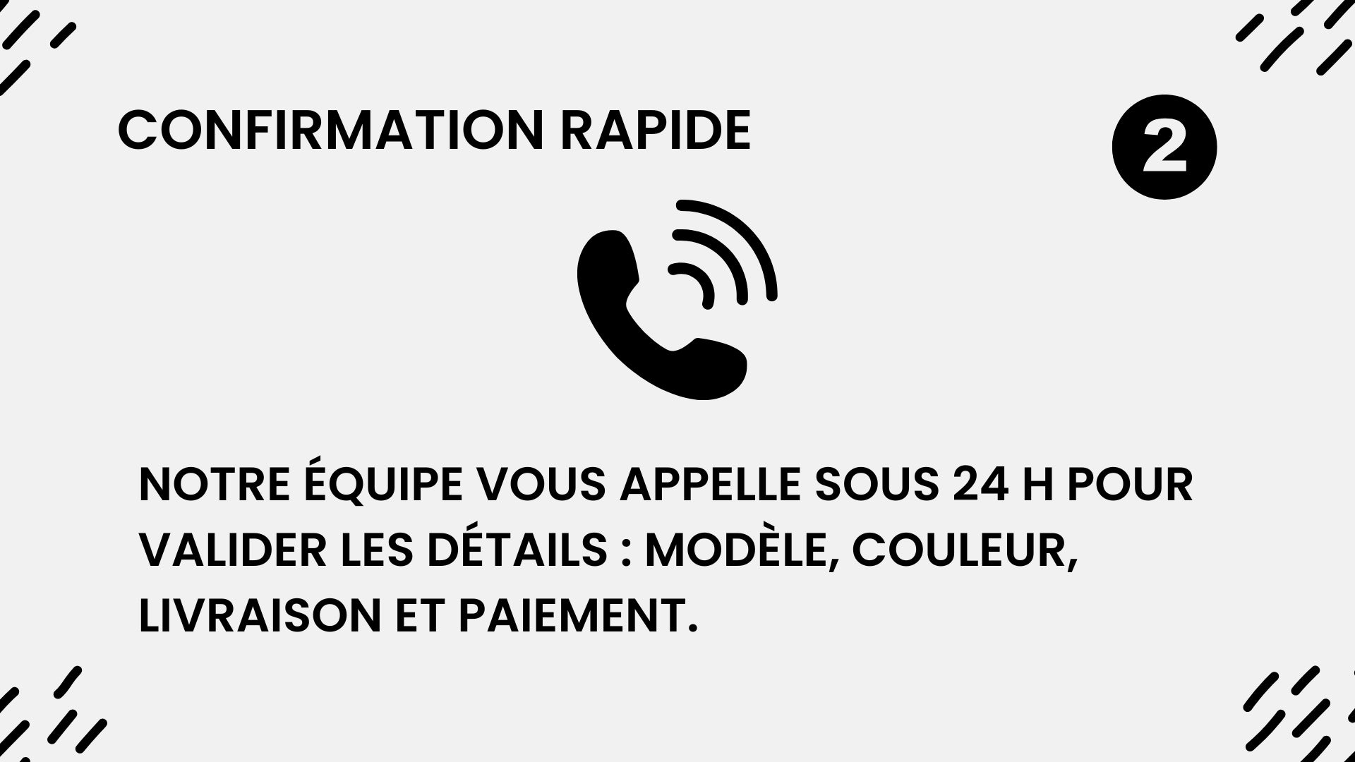 - Un membre de notre équipe vous appelle dans les plus brefs délais pour confirmer les détails : couleur, format, disponibilité et livraison.